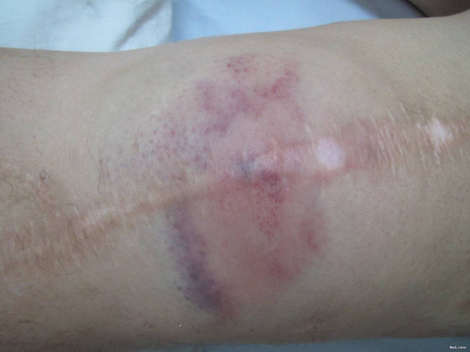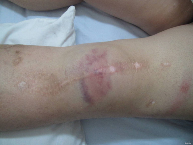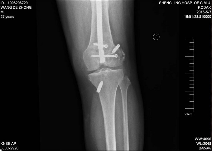 主诉:外伤后膝关节疼痛、活动受限8小时 患者8小时前打架被人钝器砸到膝关节后出现左下肢疼痛、活动受限、不能行走,受伤后意识清醒,略有头晕头迷。受伤后于我院急诊就诊,完善相关检查后以“髌骨骨折”为诊断收入院。患者目前一般状态可,无发热寒战,无恶心呕吐,受伤以来饮水未进食,未排气大便,小便如常。