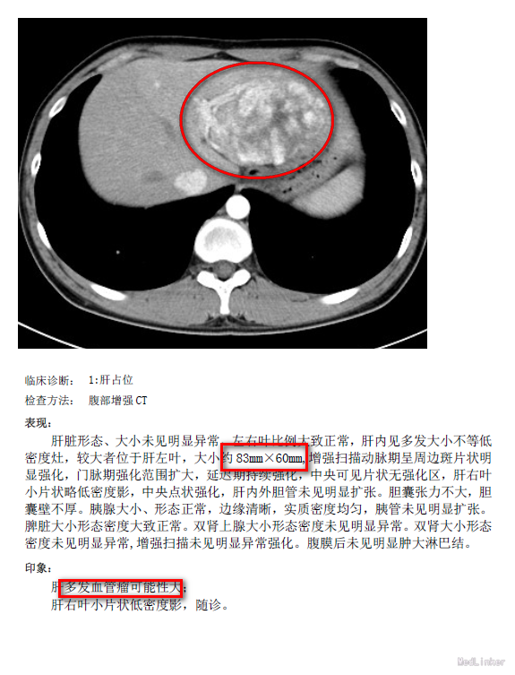 患者 男 24岁 主 诉:体检发现肝脏占位1月 现病史:患者于2015年11月2日发生车祸,为皮肤软组织外伤,无骨折、颅内出血,就诊于当地急诊,查腹部B超示“肝脏占位性病变”,建议转上级医院就诊。于11月17日就诊于我院门诊,查腹部增强CT示:肝脏形态、大小未见明显异常,左右叶比例大致正常,肝内见多发大小不等低密度灶,较大者位于肝左叶,大小约83mm×60mm,增强扫描动脉期呈周边斑片状明显强化,门脉期强化范围扩大,延迟期持续强化,中央可见片状无强化区,肝右叶小片状略低密度影,中央点状强化,肝内外胆管未见明显扩张。印象:肝多发血管瘤可能性大;肝右叶小片状低密度影。自发病以来无腹痛、腹胀、呕血、黑便、黄疸。现为进一步诊治收入我科。 既往史:2015年11月2日外伤后行破伤风抗毒素皮试(+)。