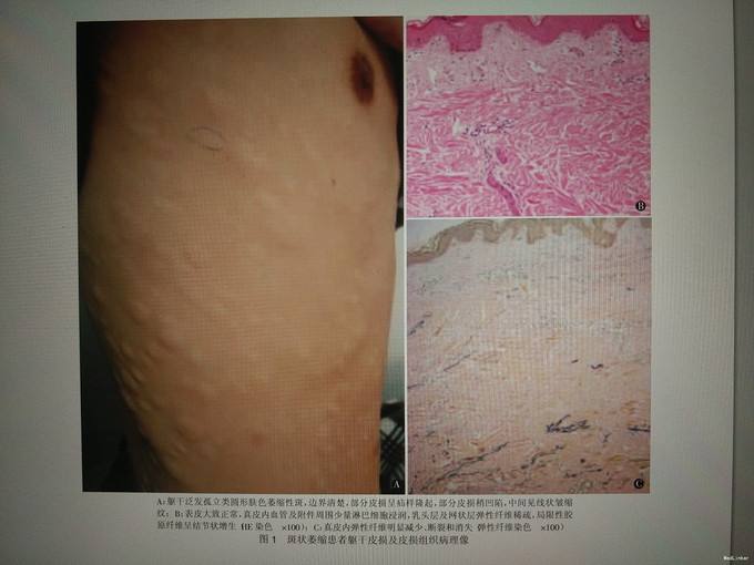 皮肤科检查:躯干及四肢近端泛发孤立不融合、约黄豆至蚕豆大边界清楚的类圆形或椭圆形萎缩性斑,呈肤色。 部分皮损呈疝样 隆起,触之柔软,按压时凹陷如袋,有轻度落空感及囊性感;部分皮损稍凹陷,中间可见线状皱缩纹,无触痛,以躯干为甚。 皮 损周边皮肤无异常。 皮损组织病理检查:表皮大致正常,真皮内血管及附件周围少量淋巴细胞浸润,乳头层及网状层弹性组织稀疏,真皮内局限性胶原纤维呈结节状增生。 弹性纤维染色示真皮内弹性纤维明显减少、断裂或消失