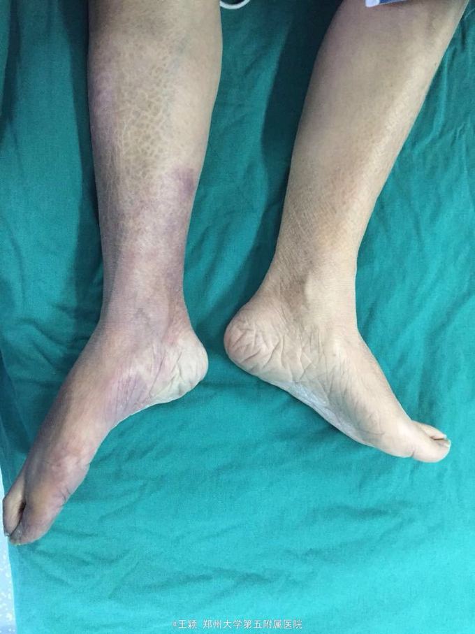 双下肢皮色紫绀,皮温凉,末梢循环差,右侧显著,双下肢各动脉搏动均未触及未见溃疡及张力性水疱。彩超示左房内可疑血栓形成,心律不齐