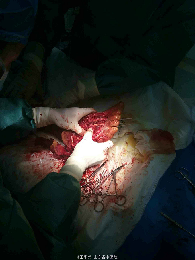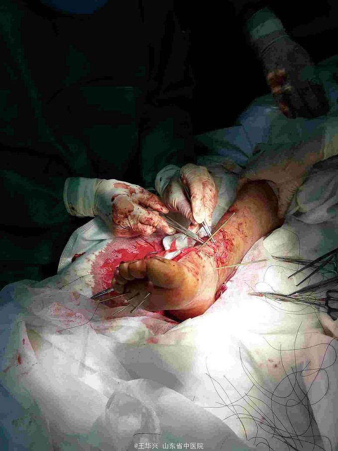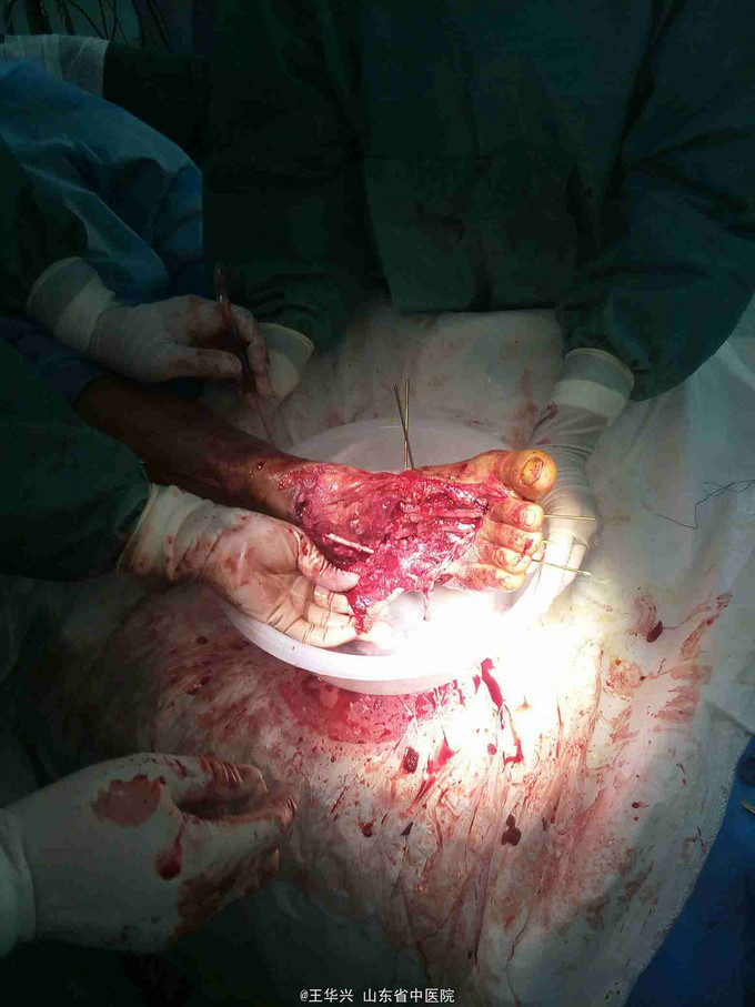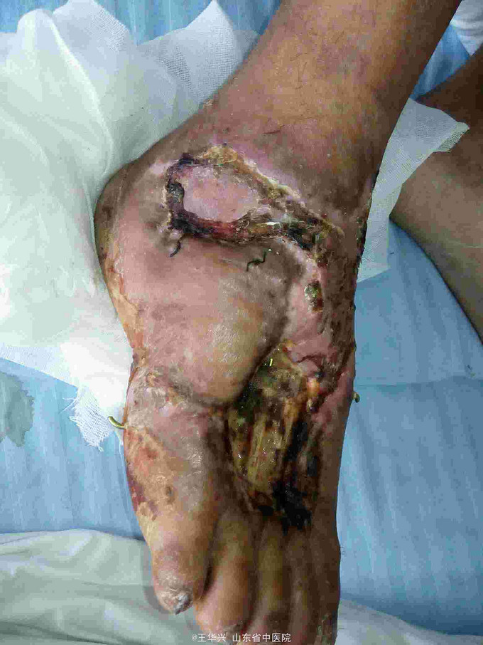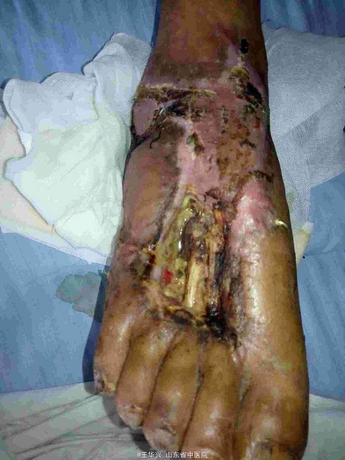 诊断:左足毁损伤 治疗:入院时已达到截肢标准,但患者家属不能接受,遂行常规手术。多次清创,行急症手术,给予简单钛针固定,软组织损伤给予原位缝合。细菌培养结果,万古霉素敏感,万古霉素局部填塞创口换药,术后给予多次清创,清除坏死组织及vsd负压吸引。待左足缺损区软组织条件可,行交腿皮瓣。