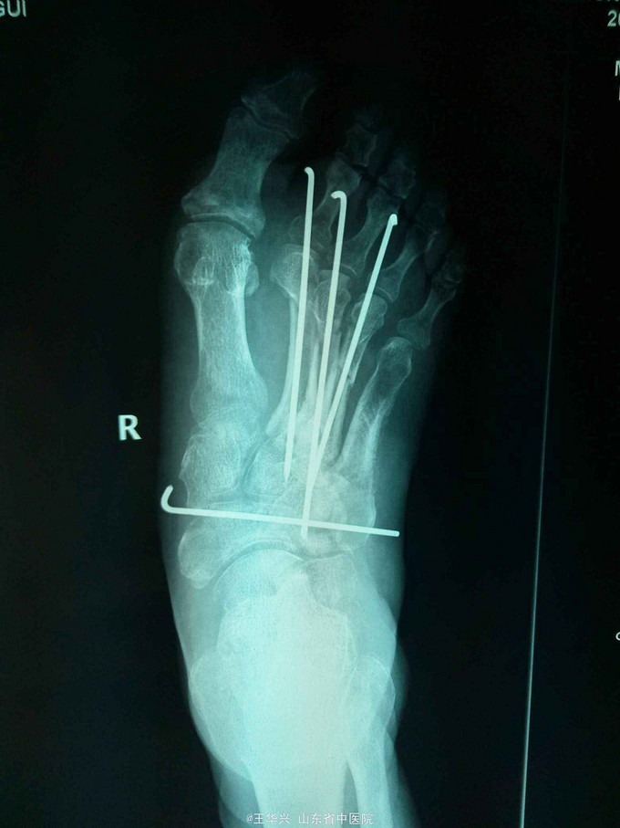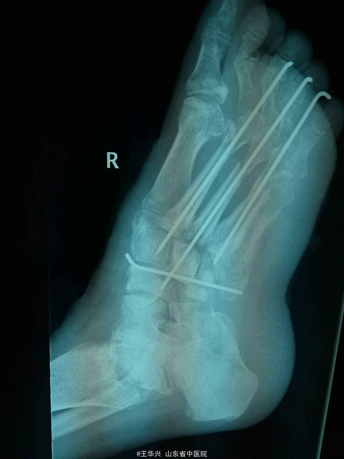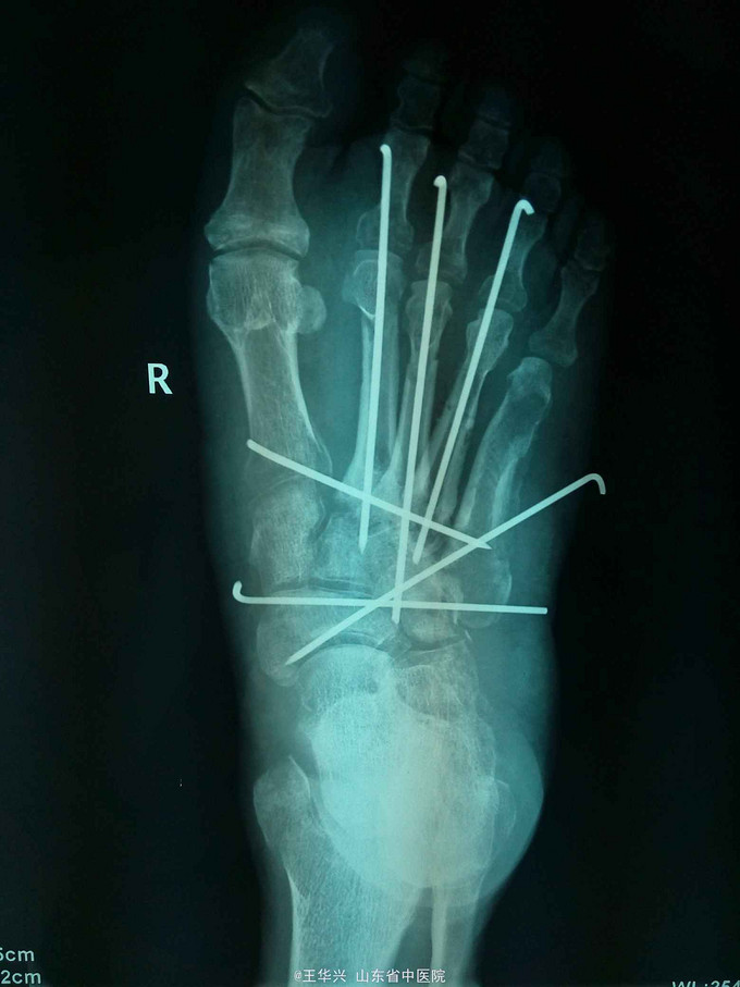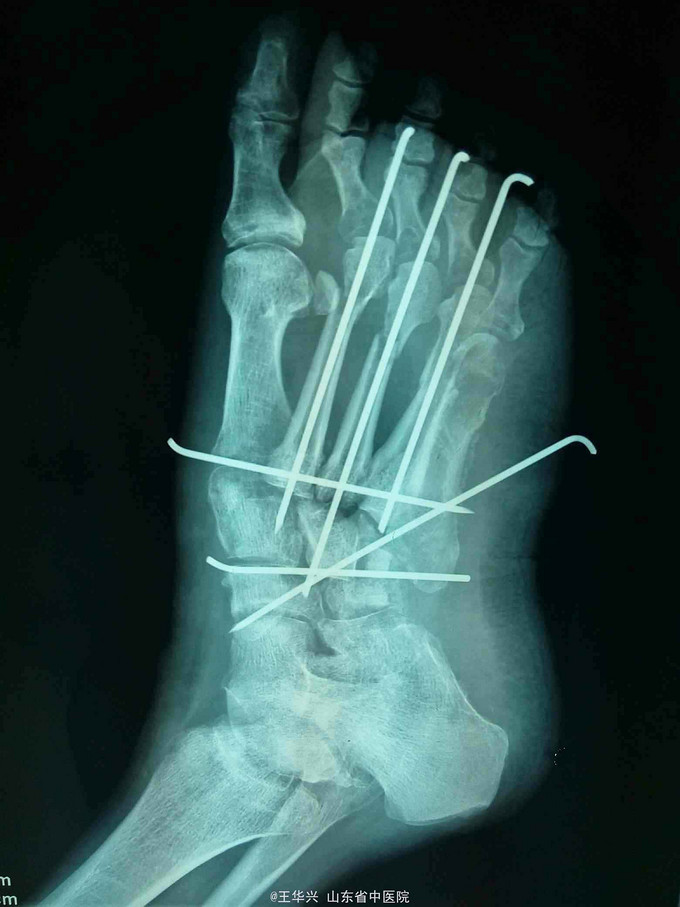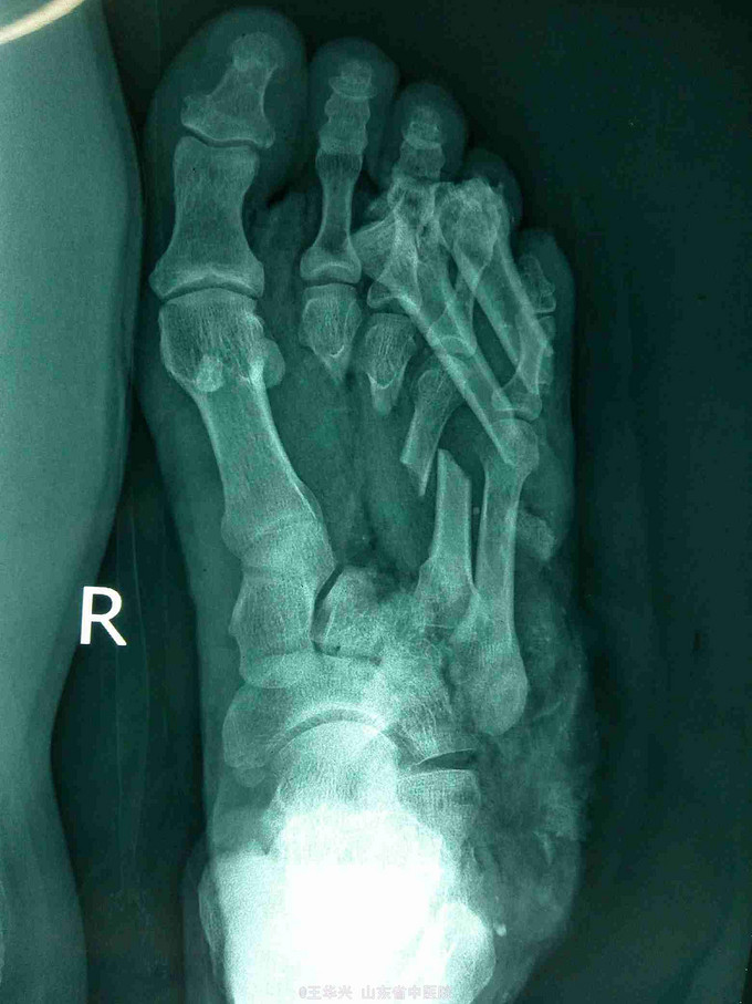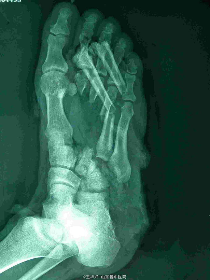 查体:左足疼痛,功能活动受限,伴有大面积软组织损伤,软组织向外侧翻转,足部前侧可见5*3cm软组织缺损,患处麻木感,足背动脉不可及。 辅助检查:x线 左足第2,3,4跖骨骨折