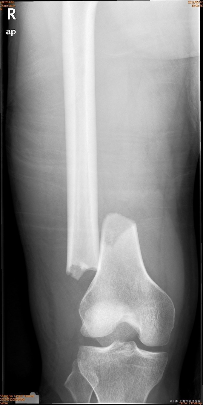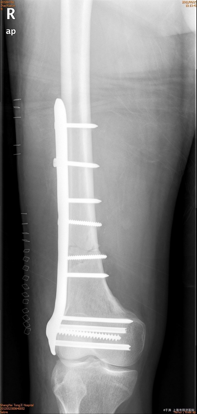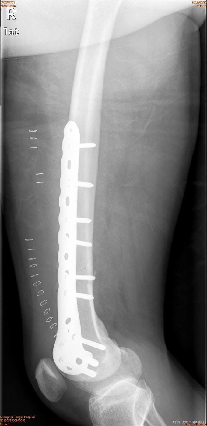 诊断为右股骨远端骨折,生命体征平稳后,行切开复位内固定术。