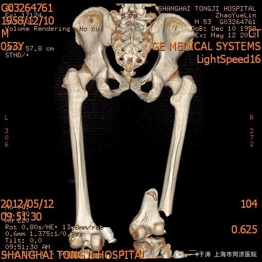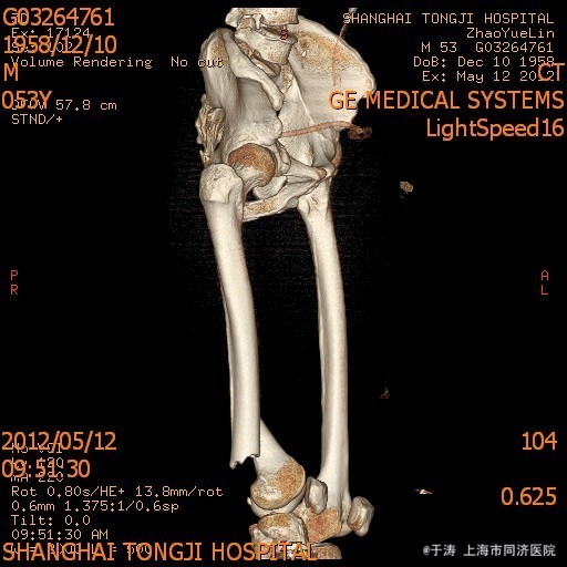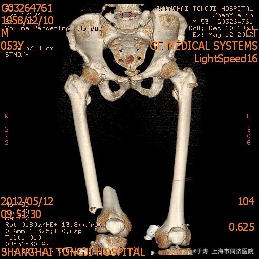 患者男,55岁,因高处坠落后右大腿疼痛伴活动障碍5小时入院。患者入院前5小时不慎从高处坠落,当即出现右大腿下端疼痛,尿道出血,胸痛,无大汗淋漓、头痛、头晕、腹痛、腹胀等。急诊X线示右股骨髁上骨折,CT示头皮血肿,右下肺挫裂伤,气胸。