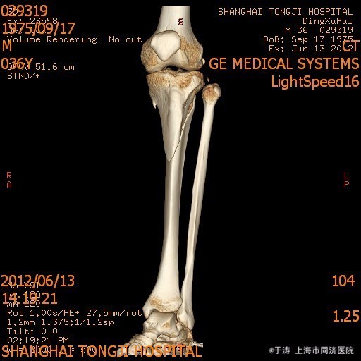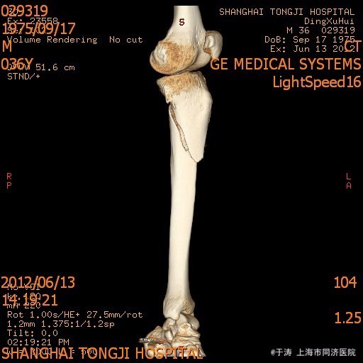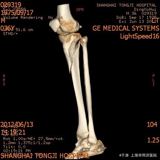 患者男,38岁,车祸后左膝肿痛9小时入院。患者9小时前车祸撞伤,于我院急诊就诊,X线及CT示:盆腔积液、左肾囊肿、蛛网膜下腔出血、左胫骨近端骨折。遂收治入院。