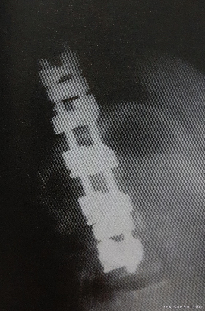 体格检查 一般状况:神志清楚,査体合作,独立行走;四肢:毛细血管充盈良好,无杵状指、发绀和水肿;肌肉骨骼:椎旁肌无明显触痛,无明显肌肉痉挛和萎缩,四肢肌力5级并左右对称,针刺觉和轻触觉正常,深肌腱反射2+、左右对称,双侧直腿抬高试验阴性,踝阵挛阴性;皮肤:背部正中术后瘢痕,愈合良好。 实验室检查:胸腰段X线检査如图