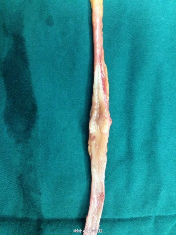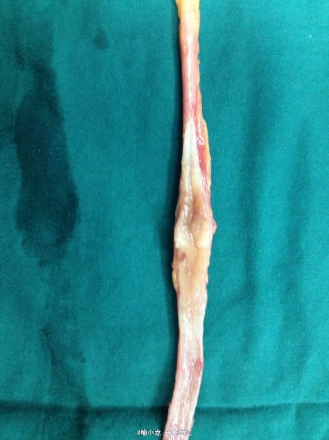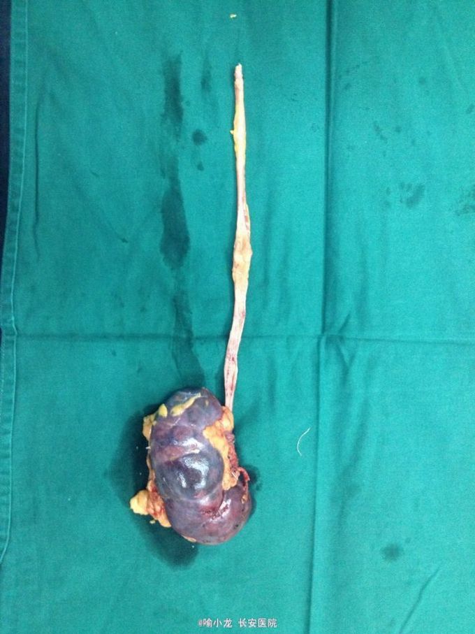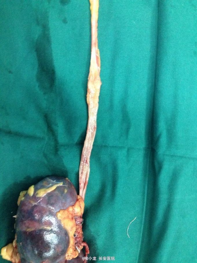 入院查血常规、肝肾功能、电解质、血脂六项、凝血四项、肿瘤四项、粪常规均基本正常;尿液分析示潜血3+,白细胞+;入院留48小时尿培养阴性;血型鉴定B型,血气分析、输血前四项基本正常;心电图、心脏彩超、腹部彩超、胸片及胸部CT检查均大致正常;下腹部+盆腔CT示左侧肾盂伴左侧输尿管全程扩张,右侧肾囊肿大小约2.0cmx1.3cm;泌尿系水成像示右肾囊肿约1.4cm,左侧输尿管上段内见条形低信号影。初步诊断:1.左侧输尿管肿瘤;2.左侧肾盂积水;3.右侧肾囊肿;4.泌尿系感染;5.高血压3级。入院后抗感染、止血对症治疗后,阵发性血尿无缓解,出现左侧肾绞痛伴发热乏力,遂急诊行膀胱镜检查并置入输尿管导管,术后阵法性血尿仍不缓解,2天后在静脉全麻下急诊行膀胱输尿管镜检查+左侧双J管置入术,术后间断寒战发热,最高体温39℃,化验尿培养示大肠埃希氏菌,病检示左输尿管高级别乳头状尿路上皮癌,根据药敏抗感染疗5天后,体温渐恢复并稳定,4天后在全麻下行左侧肾脏输尿管根治性切除术,术后病理示输尿管中段高级别乳头状尿路上皮癌局灶侵及固有层,外膜未见癌侵润,术后恢复良好。