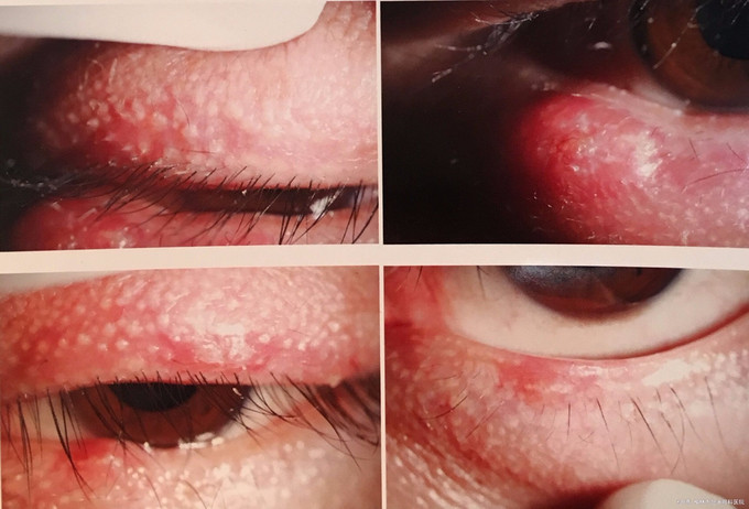 双眼视力:OD 0.9,OS 0.7,双眼上睑结膜片状肉芽肿,瘢痕形成,双眼上下眼睑肿块生长成团,红肿,压痛