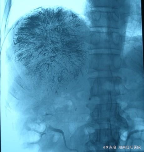 诊断:原发性肝癌(右肝巨块型)。治疗:考虑到患者的经济状况,结合肿瘤的影像学特点,经与患者充分沟通“以手术治疗为主的肝癌综合治疗思路”,最终患者选择先行TACE治疗。治疗后住院9天复查肝功能,转氨酶有下降趋势时,给予患者出院。一个半月后返院复查,转氨酶稍高,肿瘤内部碘油沉积满意,未见新生血管生成和新生病灶,建议患者继续观察、随访。