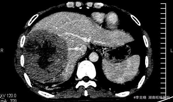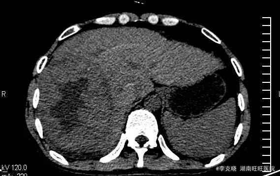 四测正常,皮肤巩膜无黄染,心肺部听诊未闻及杂音。腹平坦,未见胃肠型及蠕动波,无腹壁静脉曲张,全腹柔软,右侧肋缘深压痛,无反跳痛,肝肾无叩痛,肝肺浊音界清晰,肠鸣音正常。四肢活动自如,无水肿。 辅助检查提示:血常规、凝血常规基本正常,谷丙转氨酶278u/l,谷草转氨酶326u/l,AFP大于20000。上腹部CT增强提示:右肝巨大占位,平扫期呈低密度,动脉扫描时强化明显,静脉延迟象呈现低密度,结合病史考虑原发性肝癌可能,建议结合临床。
