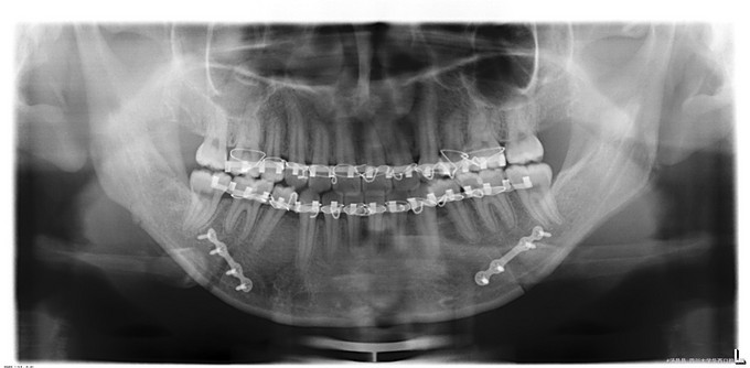 正颌术后复诊,患者因下颌前突一年前在我院正颌外科行BSSRO+双侧下颌骨去骨皮质术+坚固内固定术+牙弓夹板栓扎术,今复诊要求拆钛板