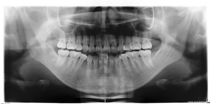 口内检查:上下牙弓关系协调,前牙正常覆合覆盖,后牙正中咬牙合,腔卫生状况良好,全口牙未见明显异常。下颌体双侧扪及钛板,颈部浅表淋巴结未触及。
