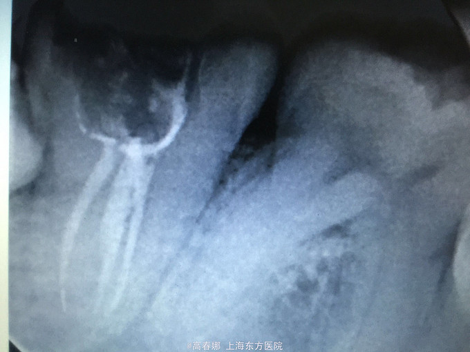 主诉:右下后牙剧烈疼痛一日。 现病史:昨晚右下后牙突发剧烈疼痛,疼痛无法定位,可放射至一侧头面部。有反复冷热刺激疼痛史。 既往史:无特殊。