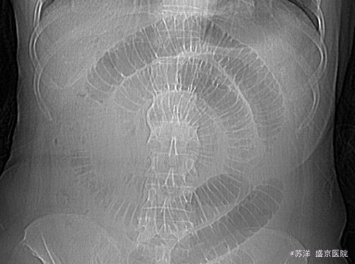 初步诊断:肠梗阻 处理方案:结合病史和检查,该患者诊断较为明确,符合肠梗阻。引起注意的是该患者腹部影像检查,可以看到肠管呈花环样螺旋盘绕,给人印象深刻。 这种表现首先考虑存在粘连导致的肠管围绕束带旋转内疝,而且肠管盘绕至这种程度时估测很难自行复位。结合患者血白细胞增高伴腹腔积液,手术指征明确。遂急诊行探查手术,证实为腹腔内粘连束带导致的肠管内疝,肠管活力尚可,予以松解复位,术后恢复良好。
