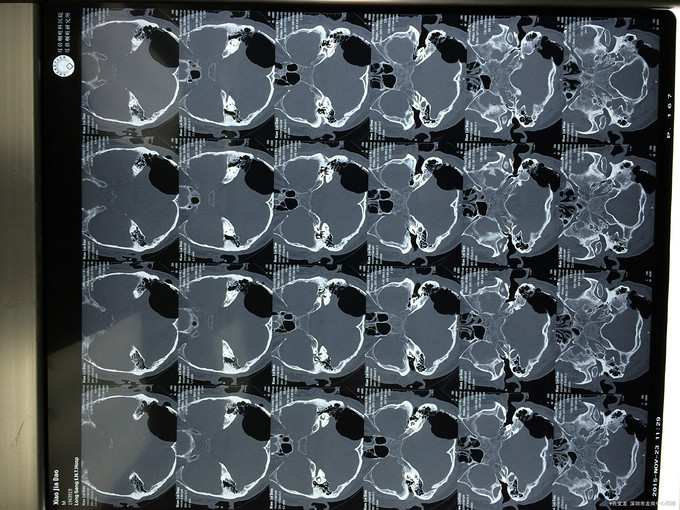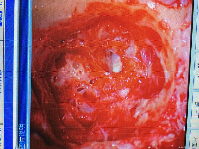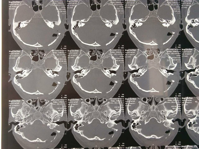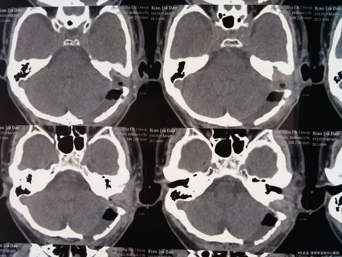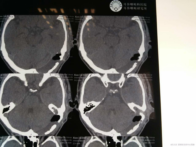 诊断:自发性颅内积气(张力性) 入院后予以完善相关检查,行颞骨乳突薄层CT扫面,考虑乳突气房内耳道漏气,粘膜瓣形成张力性气颅,再次开路手术创伤大,联合耳鼻喉科,行颅外手术,耳后入路磨除乳突气房,发现粘膜活瓣样活动,分辨漏气口,自取皮下筋膜,及带蒂肌皮瓣,填塞漏口及乳突气房,生物胶粘合,手术顺利,术后恢复良好。