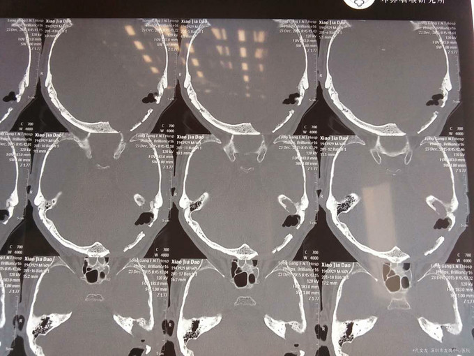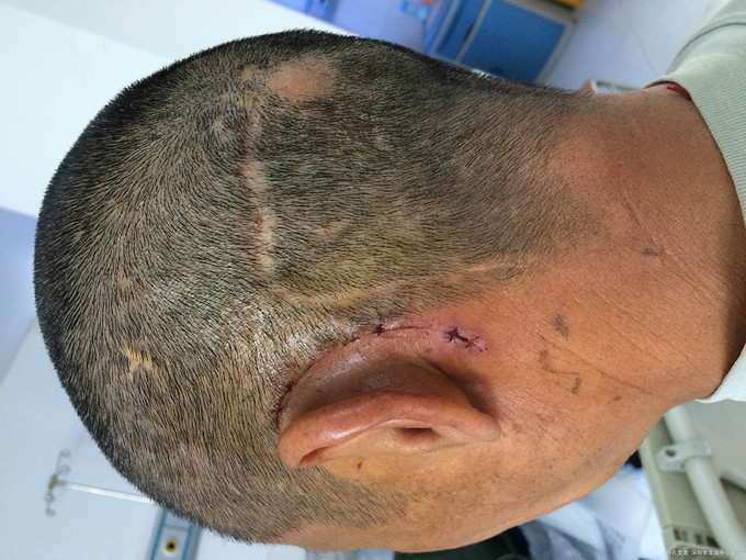 患者头痛头晕半年余,在外院性头颅CT提示颅内积气,2月前曾在北京某医院住院开颅手术治疗,术后积气复发,仍伴有头痛头晕症状,左侧枕部切口部位皮下包块,积气,并多次性皮下抽吸术,约2-3天后皮下积气复发,头晕症状明显。