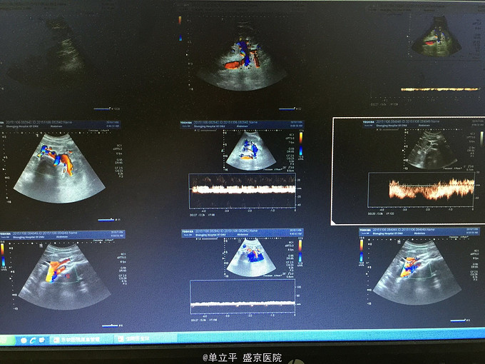 随访:患者增加体重中 讨论:此例患者,为重度血尿,当时CT报告仅提示左肾盂内充盈缺损,血块可能。仔细阅片发现,左肾呈淤血改变,肾肿胀,灌流差,因此想到胡桃夹综合症,而行超声检查,从而明确诊断。 此例患者患有贫血,胃炎,增肥困难;向患者交代,保守治疗无效可以考虑腹腔镜手术治疗,关于治疗方案 大家有什么高见?谢谢