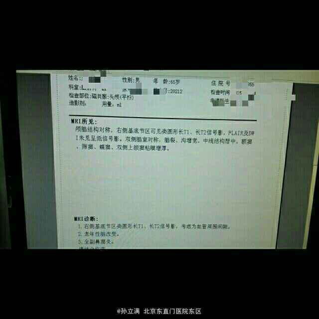 入院查体:神清,语利,反应力、理解力正常。双侧瞳孔等大等圆,直径3mm,对光反射灵敏,左眼外斜位,左侧眼睑下垂,向右注视不能及边,右眼活动正常,双眼向右侧注视可及水平眼震及水平复视。口舌不歪。四肢肌力、肌张力正常。四肢腱反射减退。病理征未引出。 辅助检查:头颅ct:右侧基底节软化灶,脑萎缩。