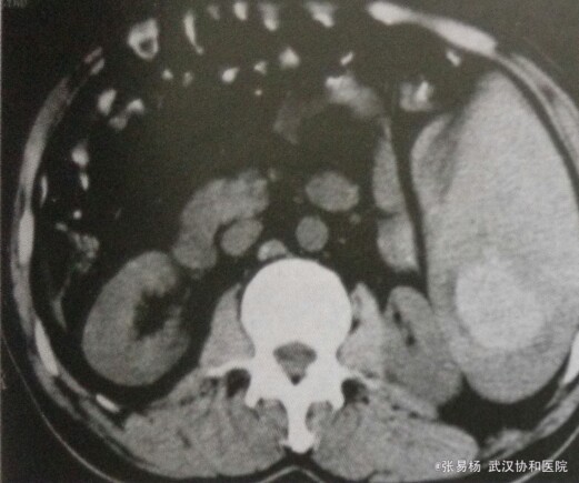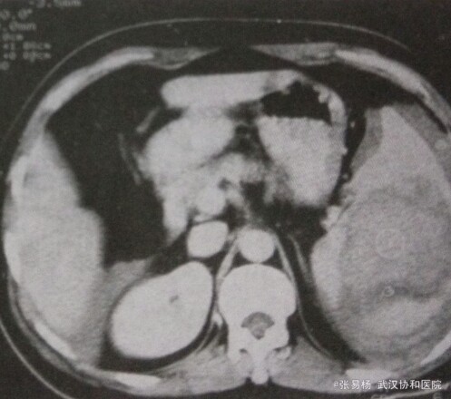 体检:胸廓挤压征+,左上腹压痛明显,脾区扣痛明显,无明显反跳痛,急诊腹部穿刺抽出不凝血。 辅检:CT示脾体积增大,脾实质内见结节状、斑片状高低混密度影,增强扫描脾血肿及包膜下积血无强化,脾实质强化。