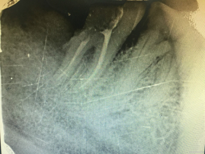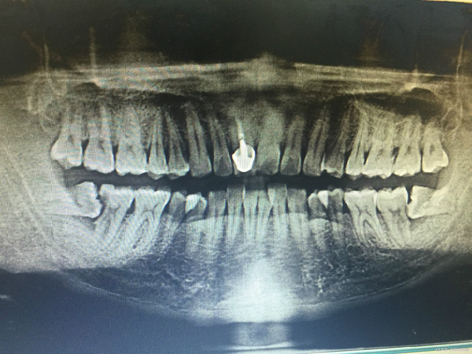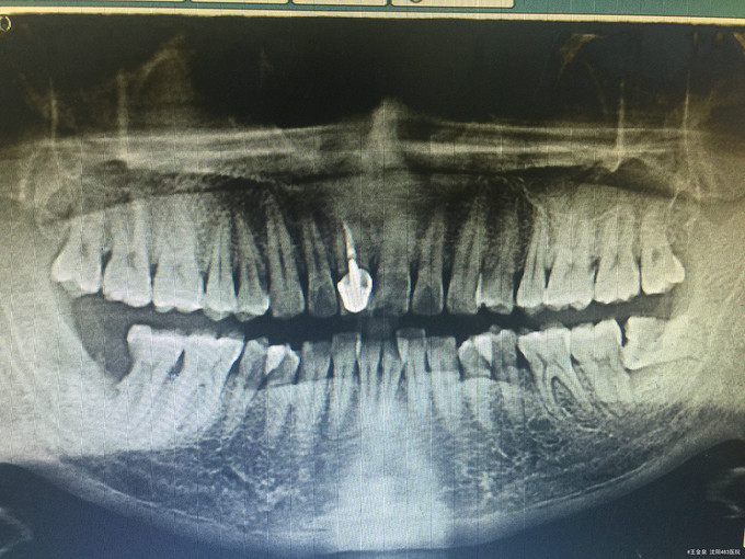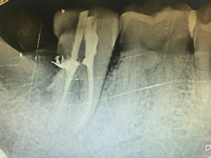 诊断:47牙髓炎,48阻生齿 治疗:经患者知情同意后,48拔除,47局麻去腐降牙合,开髓拔髓寻找根管口,建立直线通路,扩通根管,确定工作长度。S3/EDTA凝胶镍钛器械,低浓度次氯酸钠冲洗根管,预备至35/04,氢氧化钙诊间封药,一周后复诊,试主尖X线示恰充,试干根管,导AH-PLUS糊剂,VDW热压胶垂直加压根充,术后见根管恰充,暂封调合抛光。观察桩冠修复。