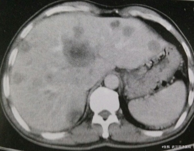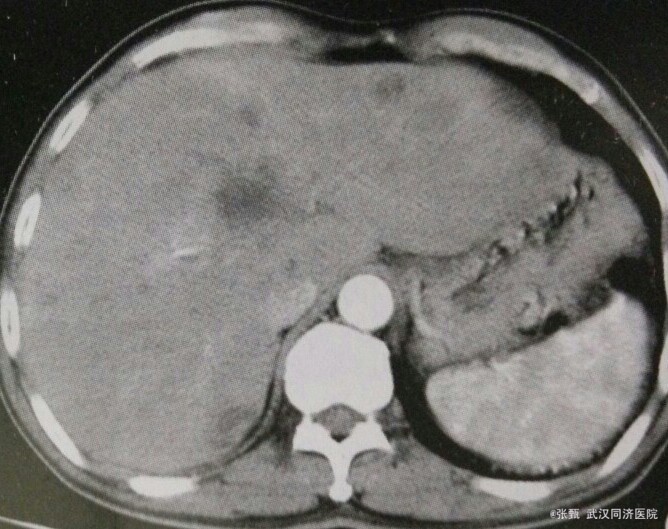 查体:肝大,压痛 辅检:甲胎蛋白正常,CT示全肝广泛性不均匀低密度影,灶内见更低密度影,扫描动脉期肿瘤不规则强化,境界清楚,中央密度低,静脉期和实质期病灶强化消退呈现”牛眼征。“