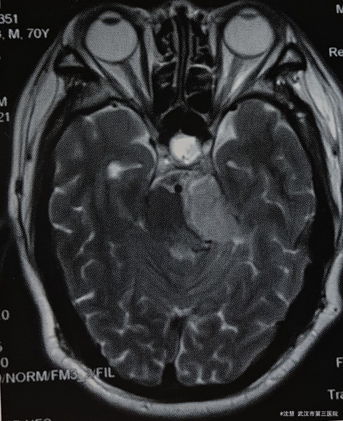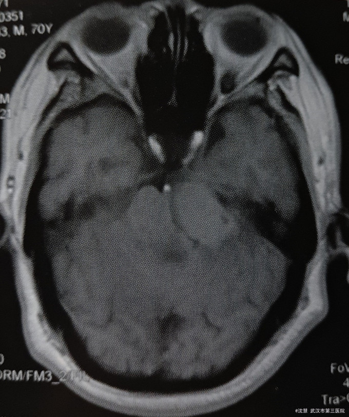 患者男,70岁,主因左耳听力减退20余年,行走不稳半月入院。患者20余年前出现左耳听力减退,无其他不适。半月前出现行走不稳,向左侧倾倒,伴左侧耳鸣、左侧面部麻木,无意识障碍、头痛,无吞咽困难、饮水呛咳、声音嘶哑等。