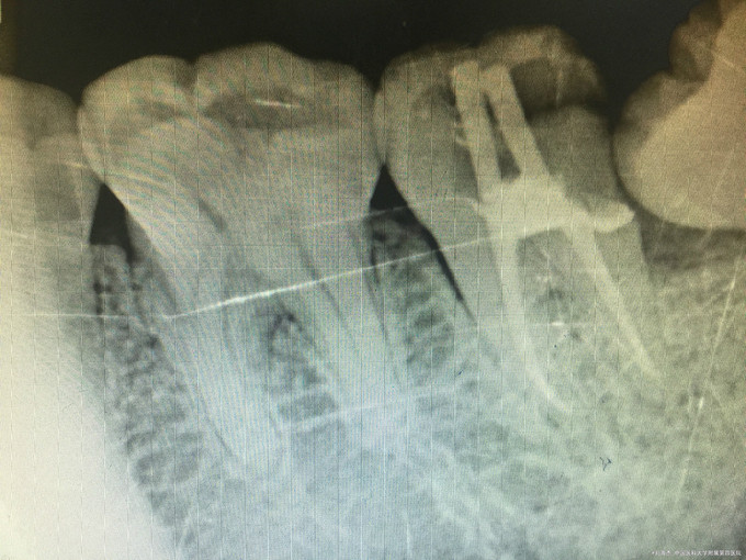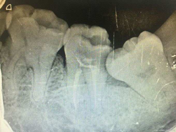 诊断:37牙髓炎,38阻生齿。 治疗:经患者知情同意后,37局麻去腐降牙合,开髓拔髓寻找根管口,建立直线通路,扩通根管,确定工作长度。vdw/EDTA凝胶镍钛器械,低浓度次氯酸钠冲洗根管,预备至25/06,氢氧化钙诊间封药,一周后复诊,试主尖X线示恰充,试干根管,导AH-PLUS糊剂,VDW热压胶垂直加压根充,术后见根管恰充,暂封调合抛光。择期拔除38.