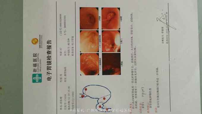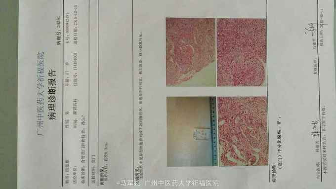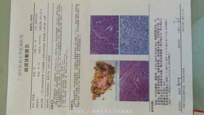 诊断:胃癌 治疗:入院后行常规术前检查,术前准备完善后在气管内插管全麻下行腹腔镜下(全胃切除)胃癌根治术,术中探查肝脏及腹腔其它部位未见明显肿瘤转移。肿瘤位于胃底近贲门处,镜下观察未侵出浆膜,与周围组织器官无侵犯及粘连。腔镜下行全胃切除、胃癌根治术,于腔镜下行食道-空肠Roux-en-Y吻合术。手术顺利,术后恢复好,术后第4天肛门恢复排气,术后第5天恢复排便,术后第6天口服碘剂造影证实无吻合口漏,遂拔除胃管,逐渐恢复饮食,术后10天出院。术后病理报告:胃底中分化腺癌,溃疡型,大小4cm×3cm×2cm,侵润胃壁全层,侵犯食管壁。两切缘未见癌累及。食道下端吻合器切除之一圈组织未见癌,淋巴结见转移癌(胃小弯侧2/13,胃大弯侧0/2)。免疫组化:CK20(-),CK7(+),GST-π(++),Her-2(-),Ki-67(40%+),PgP(-),TOPOⅡ(++),villin(+),P53(80%+)。