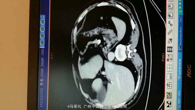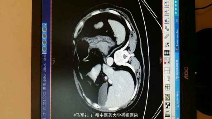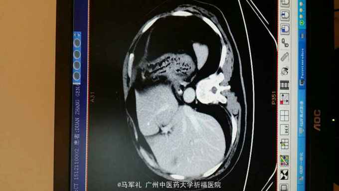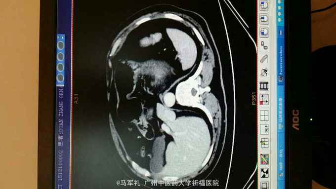 体检:T:36.3 ℃ P 95次/分 R:22 次/分 BP 115/78 mmHg 皮肤、巩膜无黄染,贫血貌,心、肺听诊无异常。腹部较平坦,未见胃肠型及胃肠蠕动波,无腹壁静脉怒张,腹式呼吸活动不受限,腹肌柔软,全腹无压痛及反跳痛,肝区无压痛,肝浊音界位置正常,肝脾未触及,Murphy征(-),移动性浊音(-),双肾区无压痛及叩痛,肠鸣音正常,未闻及血管杂音。 辅助检查:1.肿瘤标记物:CEA、AFP、CA153、CA199、TPSA均在正常范围。 2.胃镜+病理:胃底菜花样肿物,4cm×4cm,质硬。病理:中分化腺癌,HP(-)。 3.CT:胃底近贲门处局部组织不规则增厚。肝S2段小血管瘤,双肾多发小囊肿,胆、胰、脾未见异常;右肺多发泡性肺气肿。