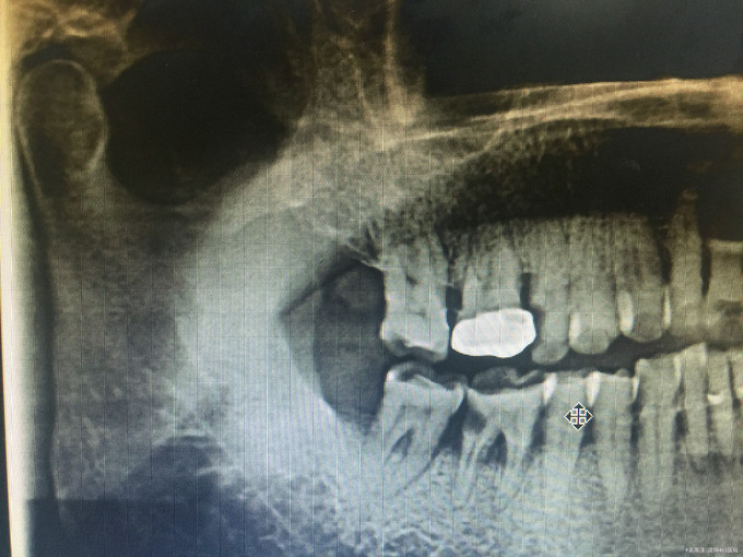 临床检查:46牙合面无明显龋坏,远中邻面食物嵌塞探疼(+),冷(++),叩(-),松动度(-),牙周红肿。 辅助检查:X线示46远中邻面龋坏累积髓腔,根尖周牙周膜增宽。