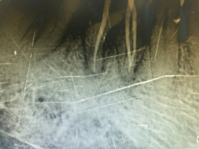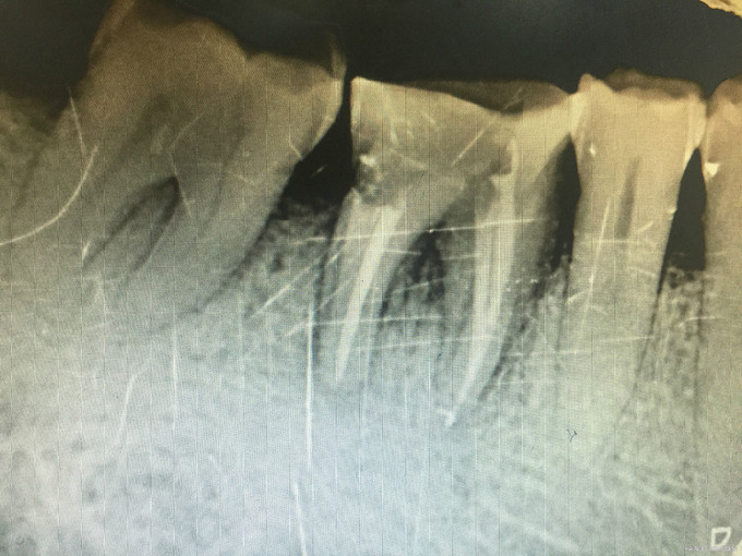 诊断:46牙髓炎 治疗:经患者知情同意后,46局麻去腐降牙合,开髓拔髓寻找根管口,建立直线通路,扩通根管,确定工作长度。S3/EDTA凝胶镍钛器械,低浓度次氯酸钠冲洗根管,预备至25/06,氢氧化钙诊间封药,一周后复诊,试主尖X线示恰充,试干根管,导AH-PLUS糊剂,VDW热压胶垂直加压根充,术后见根管恰充,暂封调合抛光。桩冠修复。
