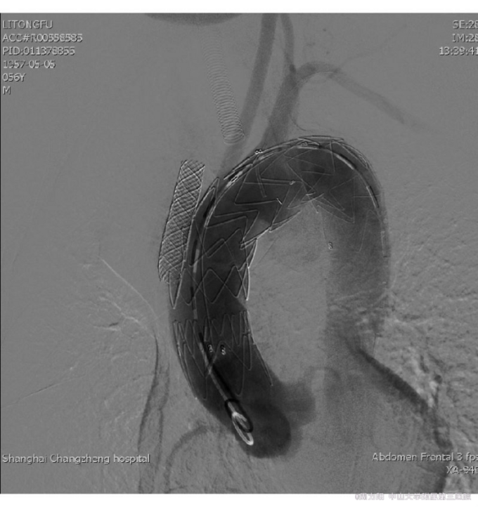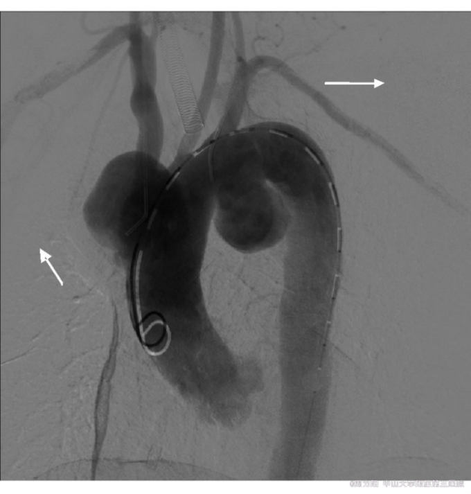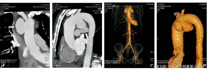 查体:体温36.5℃,心率80次/min,律齐,血压130/80mmHg,双上肢血压相同。心前区无隆起,心尖搏动增强,心浊音界向左下方略扩大,主动脉瓣区可闻及收缩期3/6级隆隆样杂音。无心包摩擦音,未及水冲脉等周围血管征。 辅助检查:血甲苯胺红不加热血清试验(TRUST)1∶128+,血梅毒螺旋体颗粒凝集试验(TPPA)+。脑脊液TRUST、性病研究实验室试验(VDRL)阴性。血压、血脂、免疫指标、肿瘤标志物、红细胞沉降率、C-反应蛋白未见异常,G试验、结核抗体(-)。患者的妻子及其他家庭成员:梅毒血清学及HIV均阴性。心超:升主动脉远端及主动脉弓起始部瘤样扩张,主动脉壁粗糙,轻度肺动脉高压伴三尖瓣返流。全主动脉CTA:升主动脉及主动脉弓见多发瘤样膨出,扩张管径分别为49.1、33.9和19.2mm,全主动脉管壁内见软硬斑块,部分见钙化影。