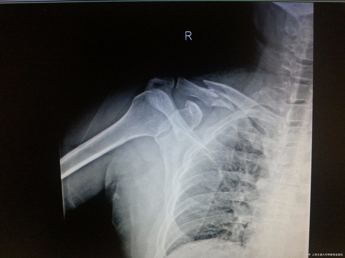 主诉:外伤后右肩部疼痛伴活动受限2天 病史: 患者,男,37岁。患者两天前踢球时与人冲撞,右肩部受撞击着地,当即感右肩部疼痛伴活动受限,未有向背部放射痛,右上肢及胸背部无皮肤破溃,未见活动性出血,远端肢体红润无苍白,无麻木感,手指活动可。摔倒前后无头晕头痛、恶心呕吐,无心悸、胸闷、呼吸困难等不适。伤后至我院急诊就诊,拍片示:右侧锁骨中段骨质断裂,并见斜形骨折线显示,断端错位明显,邻近软组织影肿胀,右侧肩锁关节间隙略增宽,予包扎固定治疗。现为进一步诊治,拟“右侧锁骨骨折”收治入本科。
