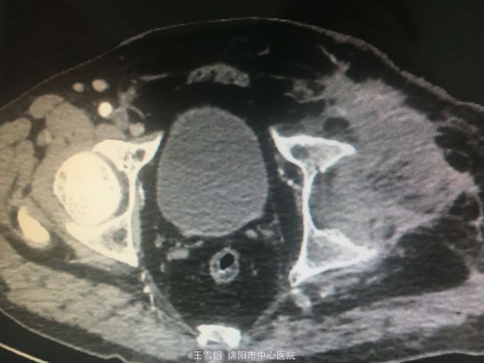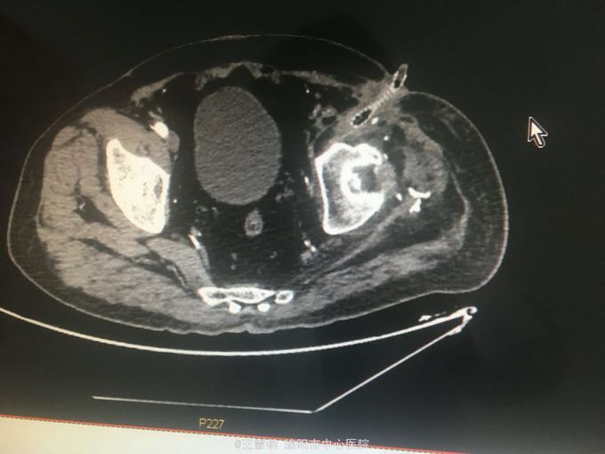 下腹部可见人工血管突出体表约3cm,伴有血性液体及脓性分泌物流出 完成CT检查
