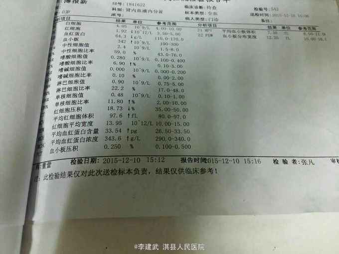 1.中度贫血;2.糜烂性胃窦炎伴萎缩;3.高脂血症;双上肢周围神经病。治疗上予以输血纠正、补充维生素B12、补充叶酸等治疗,经过治疗后贫血好转。