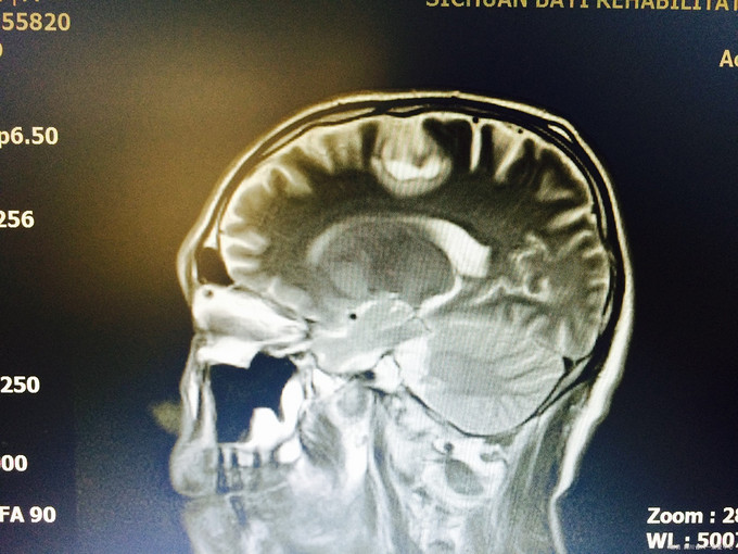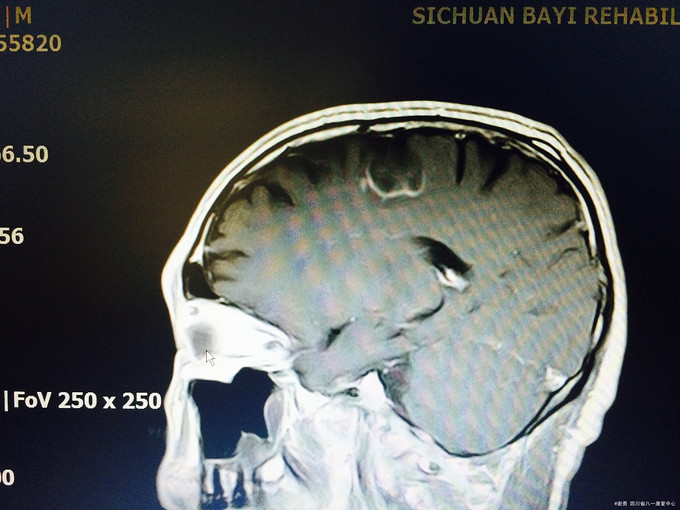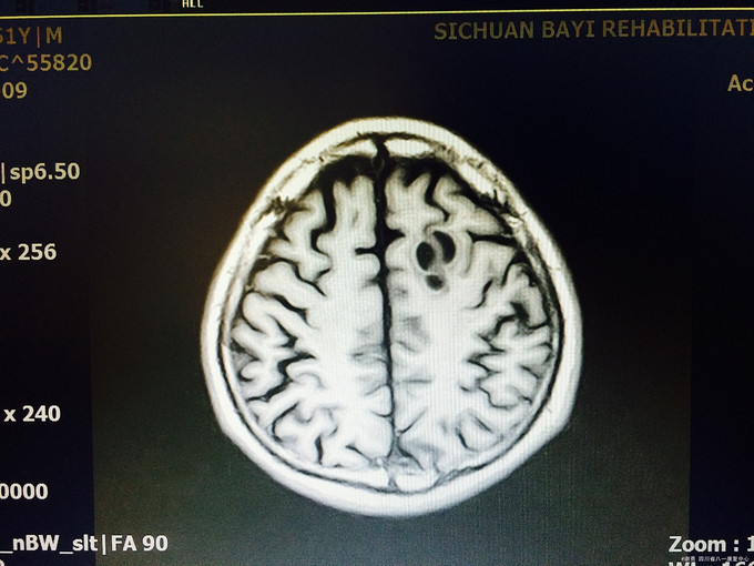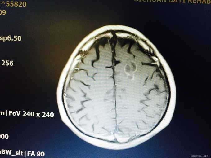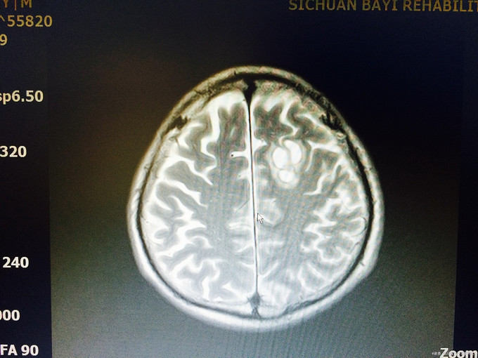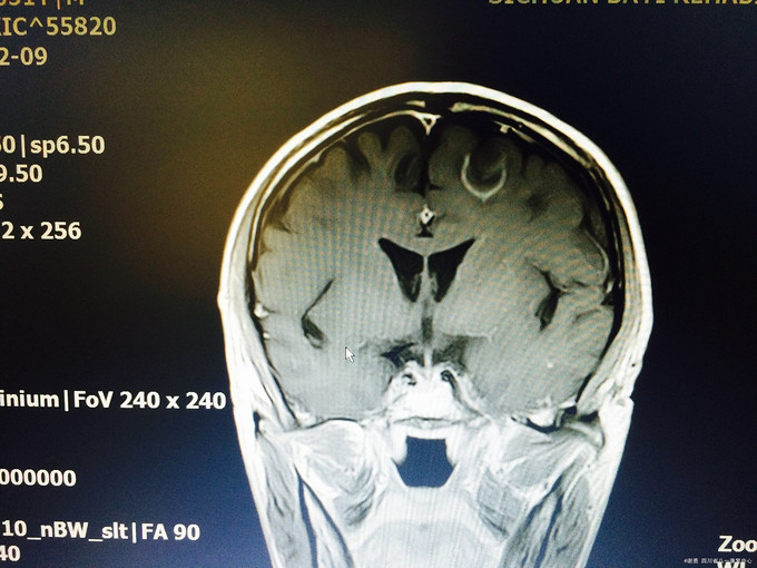 入院后积极查找占位的原因:血常规、肝肾功及电解质凝血,肿瘤标志物,输血前九项基本正常,入院第2天腰穿检查:初压:220mmH2O,末压200mmH2O,脑脊液生化:LDH 22U/L,蛋白66mg/dL,CSF常规:白细胞总数60*106/L,单核96%,涂片均未见抗酸杆菌、新型隐球菌;血液及脑脊液寄生虫全套检查均阴性;脑电图正常。治疗上首先给以脱水降颅压处理,首先考虑脑囊虫病,给以吡喹酮一疗程诊断性治疗,患者症状未见明显好转,建议转脑外科,必要时手术治疗。