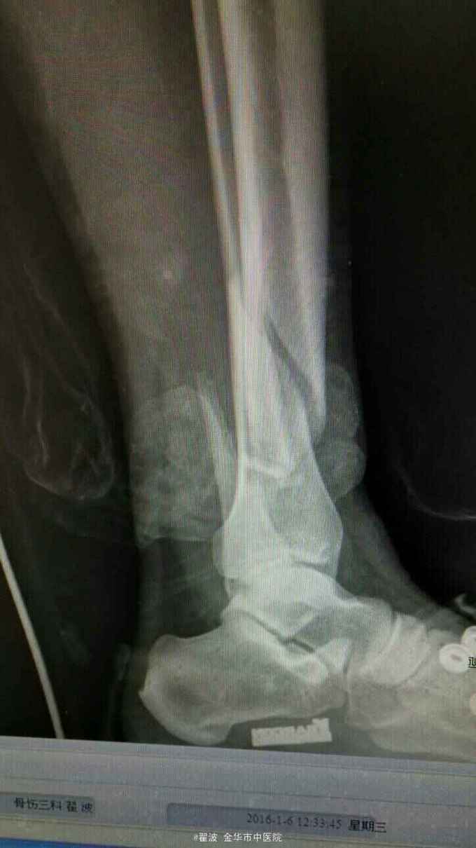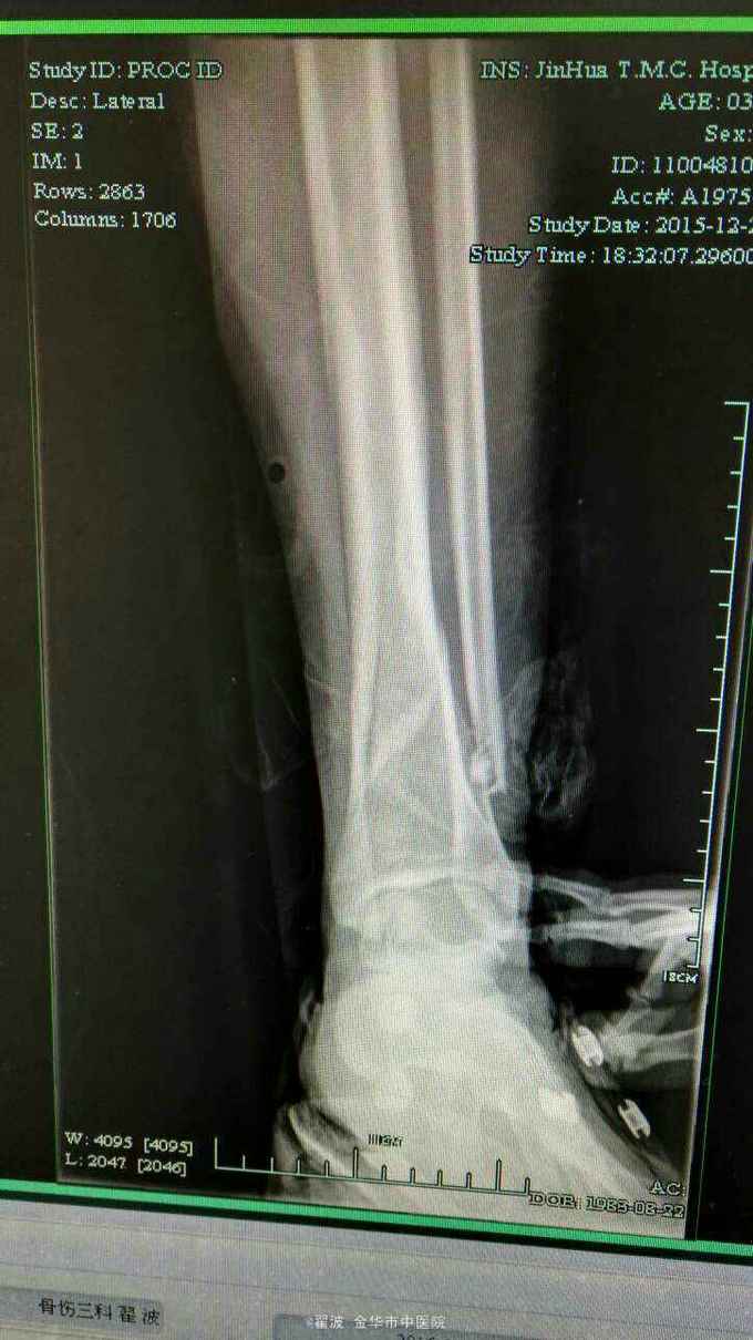 查体:右小腿下段肿胀明显,皮肤无破损,压痛阳性,可及骨擦感,并有异常活动,右下肢轴向叩击痛阳性,肢端感觉及血运正常,踝关节活动受限。