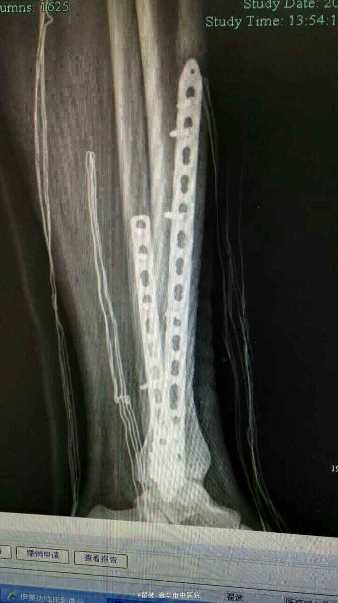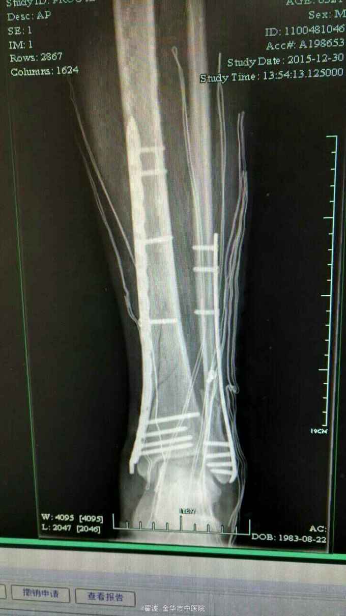 主诉:高处坠落致右小腿肿痛活动受限2小时 病史:患者2小时前从2米高处摔下,致右小腿疼痛,局部肿胀,活动受限。由家人送至我院急诊就医,摄片提示右胫腓骨粉碎性骨折,遂收住入院,入院后予抬高患肢,石膏固定,冰敷。