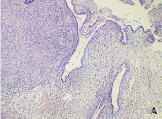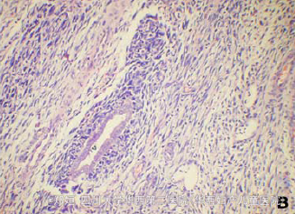 行腹部超声提示在宫颈和上段阴道处有一5*5cm的息肉状肿块 CT提示同样的信息 无淋巴结增大 胸片结果提示无肺转移 在麻醉下行双合诊,提示有一个广基底的灰白色息肉状肿块在宫颈处,并垂至阴道,阴道粘膜未受累 取一部分组织行活检病理提示有良性腺样组织和高分化肉瘤组织共存 免疫组化提示CK、vimentin, desmin和CD10(+)