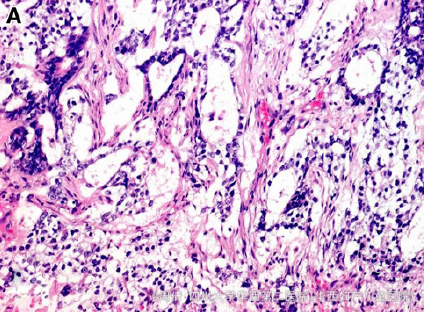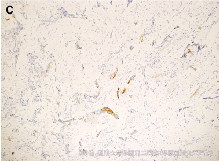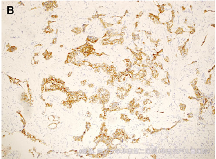 除AFP 5321ng/ml外,其余血液生化指标正常 超声提示阴道内有一肿瘤 MRI提示肿块大小3*4.5*3cm,分叶状,异质性 行活检,病理提示成片的立方形细胞排列成腺样结构,周围有疏松的粘液基质 免疫组化提示CK(AE1/AE3)强阳性 免疫组化提示AFP局灶阳性