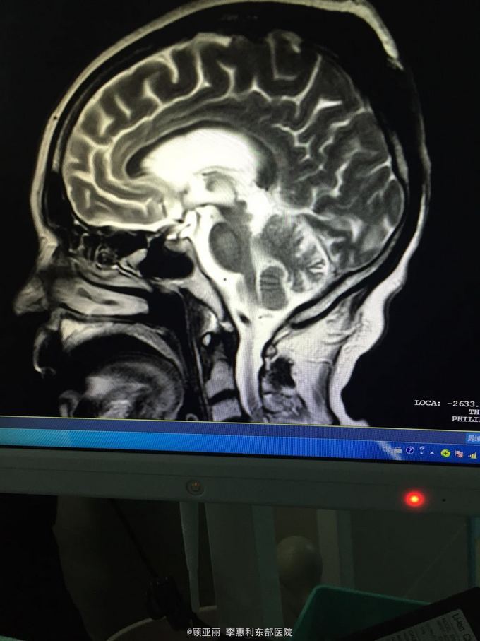 查体 言语稍含糊 声音低沉 双眼球左右活动自如 上下活动稍差 余颅神经阴性 四肢肌力正常 肌张力稍有增高 腱反射活跃 巴氏征右侧阳性 左侧可疑 颈抵抗阳性 辅助检查 头颅MRI 中脑萎缩 皮层稍有萎缩 多发腔梗灶