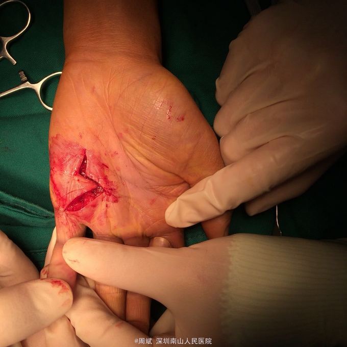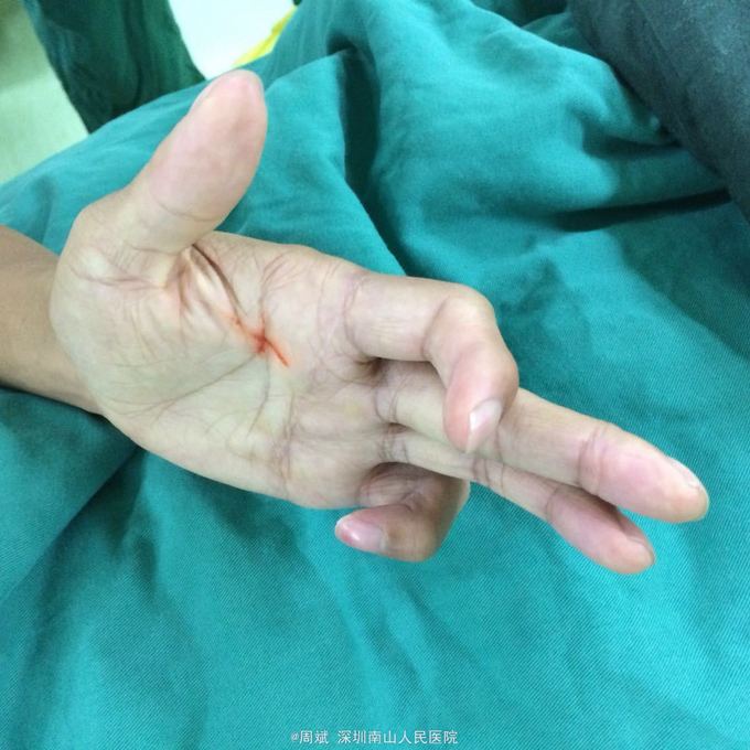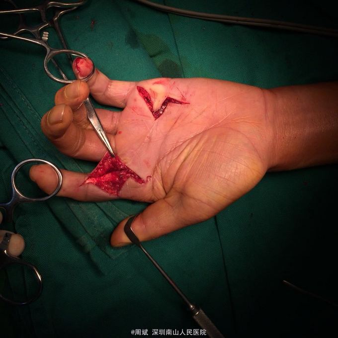 青年患者,男,23岁,因“左手掌电锯伤术后示指、小指伸直功能受限7月。”入院。 患者7个月前工作时左手掌被电锯锯伤,肌腱神经断裂,指骨骨折,入住我院我科治疗,急诊给予清创,肌腱神经探查修复,石膏外固定,手术顺利,术后住院给予进一步治疗,现患者左手示指、小指呈屈曲畸形状态,瘢痕挛缩,伸直功能受限,来我院就诊,为进一步治疗,门诊遂以左手掌电锯术后瘢痕挛缩、肌腱粘连收入我科,患者近日精神状态良好,无昏迷、抽搐,无意识不清,无发热,无头痛、头晕,无恶心、呕吐,无咳嗽咳痰,无腹痛、腹泻,大小便无异常,体重无明显异常变化。
