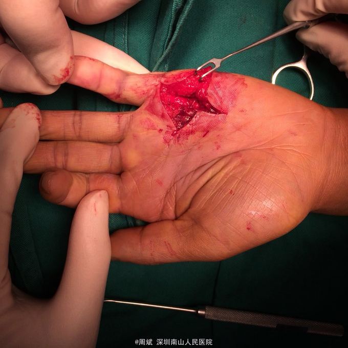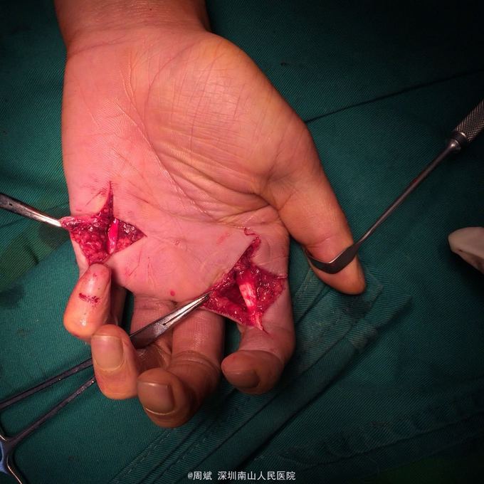 左手电锯伤术后瘢痕挛缩,示指、小指屈指肌腱粘连,示指、小指指间关节侧副韧带挛缩 左手示指,小指屈指肌腱粘连松解术
