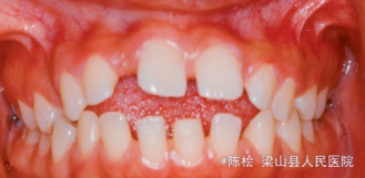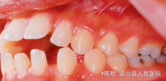 伸舌吞咽习惯,前牙4-4开合3mm,上下牙列散隙