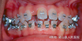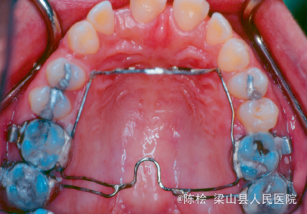 诊断:开合 治疗:双侧第一第二磨牙带环上制作TPA,同时弓丝伸至前牙段弯成腭刺,腭刺破除伸舌吞咽的不良习惯,TPA压低双侧后牙,降低后牙槽高度,改善开合.