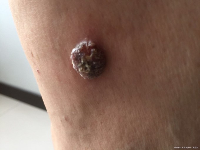 男性,76岁,小腿伸侧蚕豆大小新生物半年,逐渐增大,无明显自觉症状。