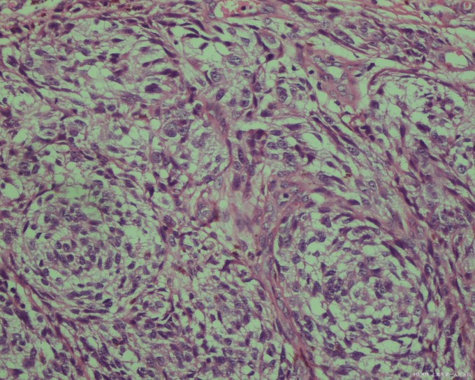1.组织病理检查 可见黑素细胞异常增生,表皮内或表皮-真皮界处有细胞巢,核仁通常呈嗜酸性的“鸟眼样”,在侵袭性黑瘤,可在真皮或皮下组织内见到黑瘤细胞。 对于典型的黑瘤,一般HE染色切片病理学检查,即可明确诊断,但非典型的黑瘤,如无色素性黑瘤等,常需辅加一些特殊技术(如S-100和HMB-45免疫组化检查)才有助于诊断。 (1)恶性雀斑痣:组织病理早期病变仅见表皮变薄或不变,基底层色素加深,但有些区域的色素可扩展到表皮的较上层,甚至达到角质层,基底层中黑色素细胞密度增高,排列不规则,真皮上层可有少许噬黑素细胞及轻度炎症浸润,比较成熟的损害中,则可见变平的表皮内基底层中黑色素细胞密度明显增高,很多黑素细胞沿表皮真皮交界处任意排列,细胞细长呈梭形,核呈显着异性性,有的皱缩,有的远较正常者大,真皮上部除结缔组织日光变性外,常有明显带状炎症浸润,浸润范围可达周围正常表皮的下方,其中含大量噬黑素细胞。 (2)浅表扩散性原位黑色素瘤:组织病理表皮棘层肥厚,在整个表皮内杂乱散布有相当一致而圆的黑素细胞,瘤细胞主要位于表皮下部,聚集成巢,似paget细胞,而表皮上部的瘤细胞则单个散布,其核不典型,染色深,胞质丰富,含有多少不等的黑素颗粒,几乎都无树枝状突,真皮内有噬黑素细胞与炎症细胞浸润,其浸润范围可超过病变而达到周围正常表皮下方。 (3)肢端雀斑样原位黑色素瘤:组织病理早期损害表皮棘层肥厚,基底层黑素细胞及黑素增多,只有灶性黑素细胞不典型,故易认为是良性病变,以后,瘤细胞偶呈梭形并出现于表皮上部,但多数病例可同时见梭形与圆形Paget细胞,且有时以后者占优势,黑素明显增多,以致在真皮浅层出现噬黑素细胞,并在角质层也可见有大块黑素颗粒聚集。 (4)恶性雀斑样痣性黑素瘤:组织病理早期仍具有恶性雀斑样痣的特点,在深色皮损处取材时可见表皮基底细胞黑色素增多,整个基底层中可见奇形怪状的梭形黑色素细胞,其核有显着的异型性,在淡色皮损处取材时,基底层中可见多数大而异形的黑素细胞,严重者这些异形细胞几乎全部代替了基底层细胞,有些瘤细胞聚集成簇,并已侵袭至真皮,真皮中的瘤细胞呈梭形,聚集成团,含黑色素量不多,而周围的巨噬细胞中则含有很多黑色素,瘤细胞常侵犯毛囊的外根鞘,具有诊断价值,真皮浅层胶原纤维常有嗜碱性变,在肿瘤周围可见带状炎症浸润。 (5)浅表扩散性黑色素瘤:组织病理在侵袭性生长不明显时仍可见Paget细胞样黑色素细胞散布于表皮内,但在真皮乳头内亦见有上述细胞,表示已突破原位,侵袭性生长时,真皮内即出现瘤细胞结节,瘤细胞呈上皮细胞型,梭形细胞型,痣细胞样或混合存在,如以上皮细胞为主,可形成腺泡状结构,周围有细的胶原纤维环绕,在肿瘤病变的临近真皮内可见带状炎症浸润。 (6)肢端雀斑痣性黑色素瘤:组织病理早期损害的主要特点是不典型黑色素细胞以恶性雀斑样痣性黑色素瘤的扩散方式向上移行,但其下方真皮内的胶原纤维无光线性改变,大多数不典型性黑色素瘤细胞聚集在基底层及其上方,但一些小的区域内出现类似浅表扩散性黑色素瘤的改变,以后则向真皮内侵袭性生长,转移快。 (7)结节性黑色素瘤:组织病理瘤细胞侵犯真皮,并出现瘤细胞结节,但邻近表皮内无病变,间或在肿瘤旁可见少许表皮内病变,但一般不超过3个表皮突范围。 (8)痣细胞恶变:组织病理黑痣的恶变通常最早发生在真皮表皮交界处,痣细胞呈异常增生,且痣细胞巢扩大互相融合,在痣细胞巢之间常有异型黑色素细胞增生,异型黑色素细胞不仅在表皮内扩展,而且向真皮内侵袭性生长,在真皮内不出现成熟现象,常有核丝分裂象,偶然,痣细胞的恶变也可从真皮深部开始,但在其他部位仍可见残余的痣细胞。 (9)无色素型恶性黑色素瘤(amelanotic malignan melanoma)组织病理:在HE染色切片中无明显黑色素可见,但多做切片或银染,仍能发现少数细胞含有黑色素,如用电镜检查或以新鲜组织作dopa反应则能证实黑素的存在,故无黑色素性恶性黑色素瘤并非没有黑色素,只是在常规染色中不能见到而已。