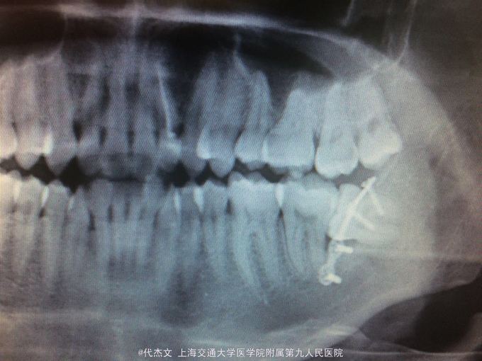 随访愈合可。讨论:骨折线附近智齿在不影响固位时尽量拔掉。若术后拆钛板时拔则适当延长拆钛板时间。
