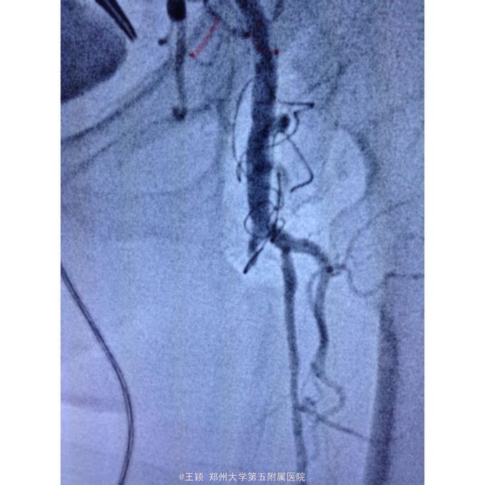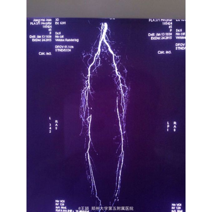 双下肢皮温低,皮色苍白,左足第五趾趾端坏死,右侧股动脉搏动可,左侧股动脉搏动弱,双侧掴动脉,胫前及胫后动脉搏动均未触及,CTA见图