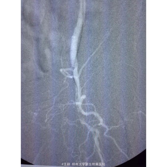诊断为:下肢动脉硬化闭塞症D级并左足坏死 处理:85岁高龄患者,拟局麻翻山,先行处理左侧,术中患者不能配合,且造影发现左侧股总动脉远端近分叉处存在重度狭窄,钙化明显,即使顺利开通闭塞段,股总动脉的处理非常棘手,单纯球扩效果不佳,放置支架势必遮挡股深动脉,一旦出现问题,再次处理非常麻烦,综合考虑后改为全麻,局部切开后,剥脱股总及股浅动脉近段斑块,股浅动脉远端未进一步处理,术后造影,股总动脉远端狭窄解除,股深动脉显影较前改善,术后下肢皮温皮色均好转!